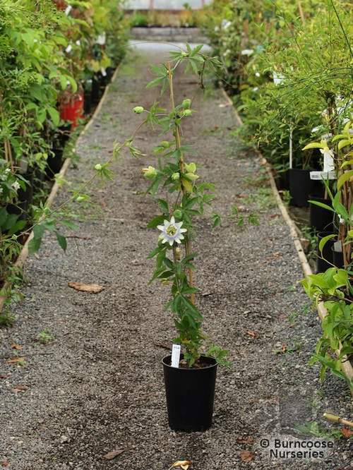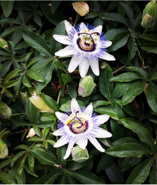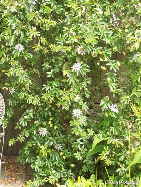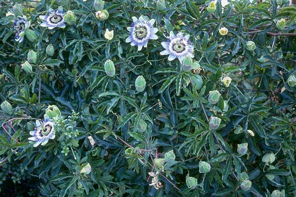 پیچ ساعتی بالا رونده با رشد سریع که طول آن 10 متر هم می رسد. گلها با یک ردیف گلبرگ سفید و جذاب با کاسبرگ ها و رشته های آبی سفید و ارغوانی رنگ که به صورت تاجی در مرکز قرار گرفته اند. برگها پنجه ای با پنج تا هفت برگچه .